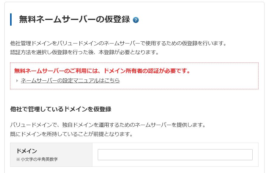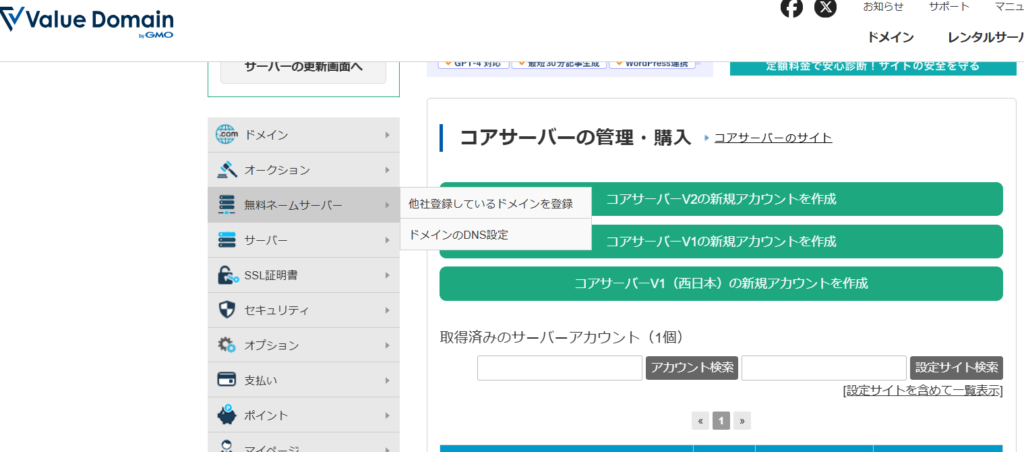 次はValue Domainの画面に来て無料ネームサーバーに入る