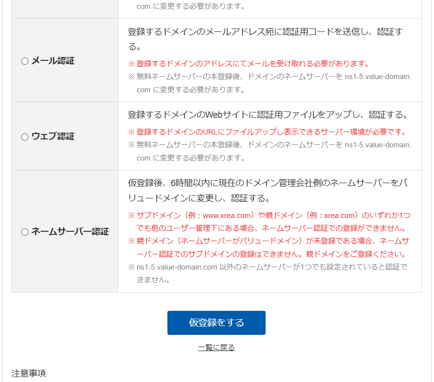 その下にネームサーバー認証が有るそれにチェックを入れて仮登録をおす