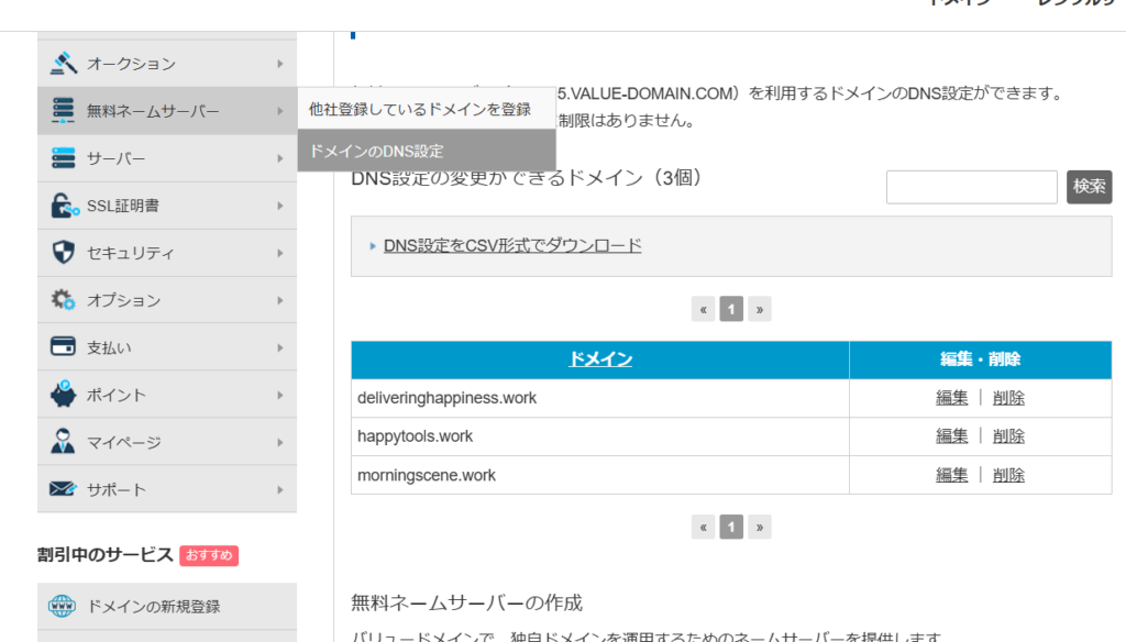 ドメインのDNS設定に入る 自分の借りているドメインの編集をおして中に入る